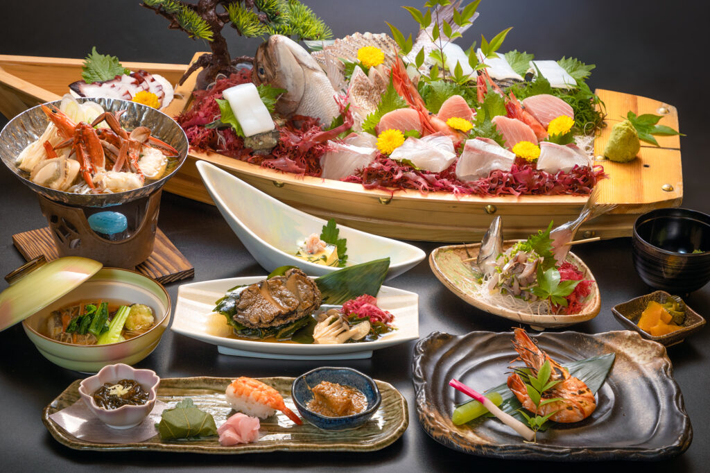 その地元網代に毎朝水揚げされる新鮮な魚介類をふんだんに使用した活き魚膳を是非お召し上がりください。